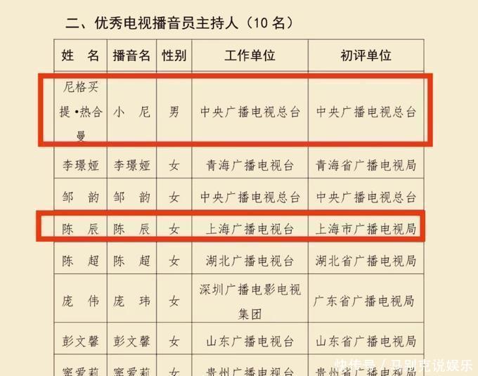 12月9日,国度广电总局重磅发布第三届中国播音主握“金声奖”获奖名单。42岁的尼格买提·热合曼(小尼)代表中央播送电视总台,46岁的陈辰代表上海播送电视台,共同取得优秀电视播音员主握东谈主奖。